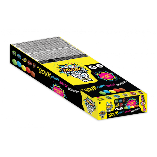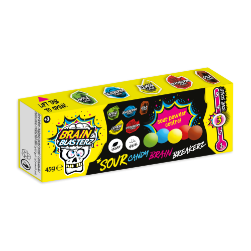 Hard, sour candy breaks that explode with tangy flavour. A fun and challenging treat. 14x45g. Vegan and Halal suitable.