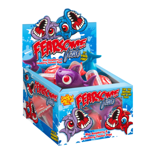 Fruit flavoured fearsome fish lollipops in strawberry and blue raspberry flavours. 15x15g.