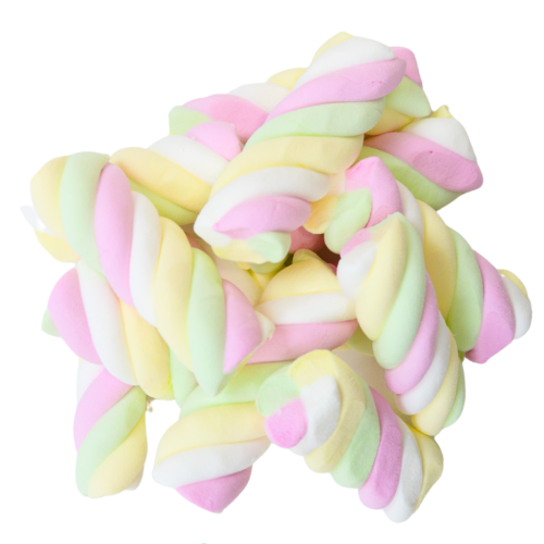 Fluffy, colourful long twist shaped marshmallows. 1kg. Halal.