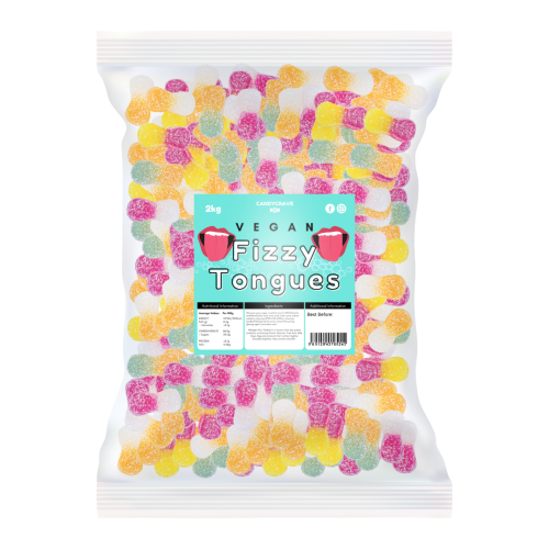 Chewy, fizzy tongue-shaped sweets. A tangy and fun treat. 2kg. Vegan.