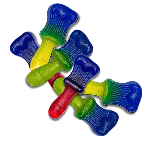 Assorted fruit flavour gummy sweets, shaped like paint brushes. Enjoy as the brush paints your tongue blue! 2kg. Vegan.